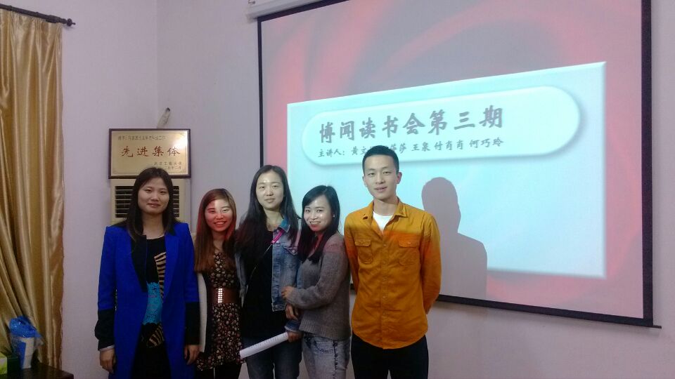 2014年4月23日,腾博tengbo9885官网“博闻”念书会在学院聚会室顺遂举行。本期念书会由我院学生会主席刘存地、学术部部长付肖肖主持,组织学院研究生起劲加入。本次念书会的主讲人划分是谢莎莎、王泉、黄文娟、何巧玲、付肖肖,五位同砚以“选择绿色生涯,离别十面‘霾’伏”为主题,划分作了精彩生动的报告。