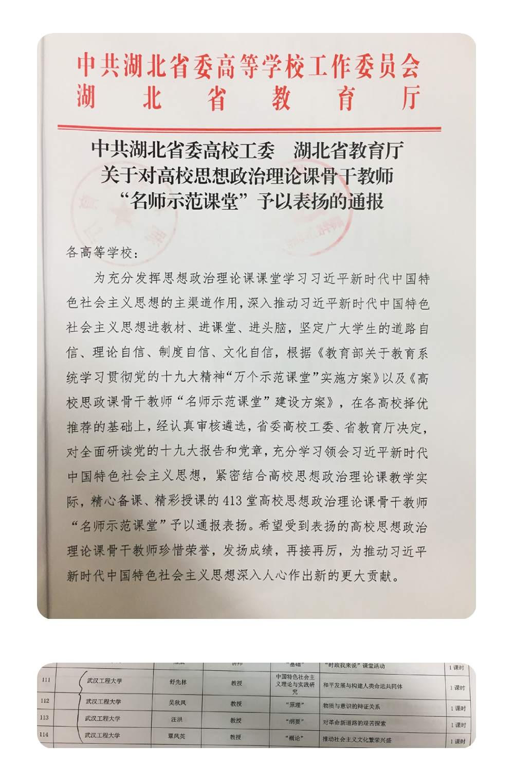 日前,中共湖北省委高校工委、湖北省教育厅印发了《关于对高校头脑政治理论课主干西席“名师树模课堂”予以表扬的转达》,我院有4位西席教学的4堂课乐成入选“名师树模课堂”并受到表扬。它们划分是:舒先林教授教学的《清静生长与构建人类运气配合体》、吴秋凤教授教学的《物质与意识的辩证关系》、汪洪教授教学的《对革命新蹊径的艰辛探索》、覃凤英教授教学的《推动社会主义文化昌盛郁勃》。
