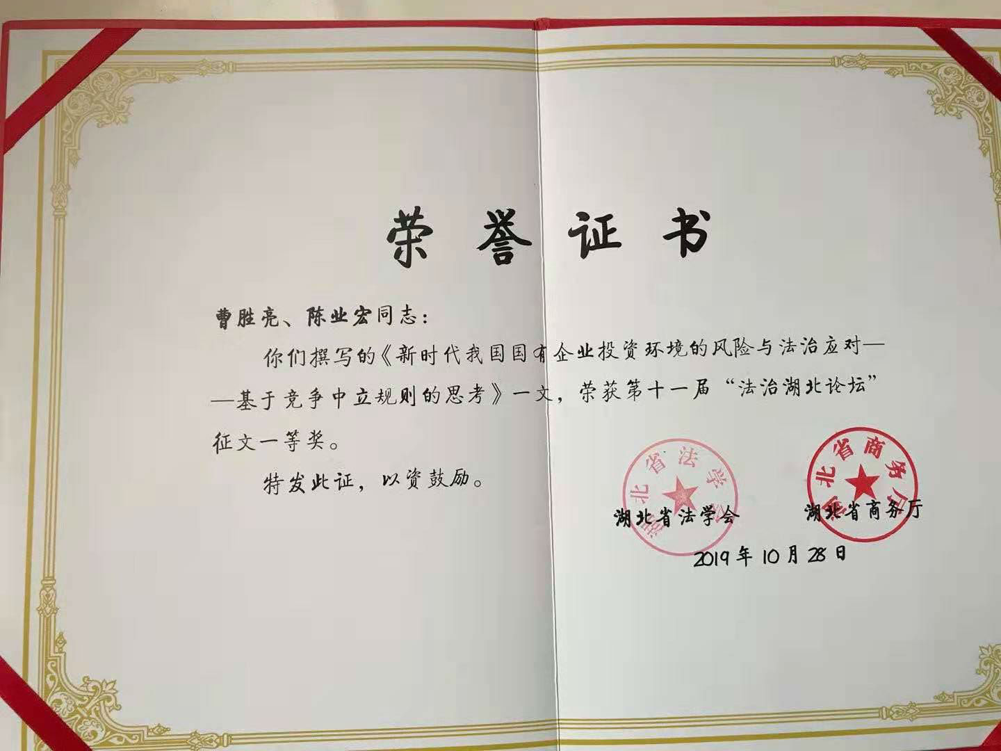 我院曹胜亮教授应邀出席第十一届“法治湖北论坛”并获大会论文一等奖