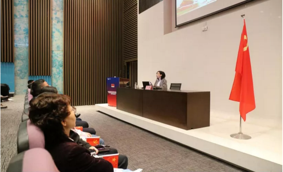 聚会由三大议程组成 ,在举行了“党史学习互动展”和“建党100周年运动”启动仪式——园区党员宣誓仪式 ,综合党委书记刘励力主题讲话两项议程后 ,我院西席兰洁博士为园区党员干部作了“从‘四史’学习看中国共产党党史党建与反腐倡廉”的主题报告。