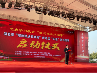 (通讯员黄小倩)10月23日上午,中共湖北省委宣传部、省委讲师团在鄂州市凤凰广场举行全省“理论热门面扑面”树模点“五送”惠民运动启动仪式。出席今天启动仪式的有湖北省委宣传部、湖北省委讲师团、湖北省教育厅、鄂州市委、鄂城区委等有关部分向导,武汉工程大学等加入高校及树模点所在市州县(市、区)向导和专家。
