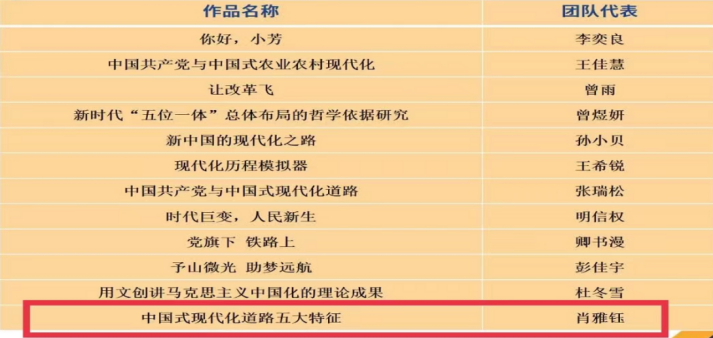 本次角逐运动旨在指导大学生起劲运用马克思态度、看法和要领,熟悉中国,熟悉天下,并在观天下的实践中拓宽视野、增添知识。此次共有73支参赛队进入决赛,各参赛步队通过团队分工协作,通过模拟访谈、播放视频、情景模拟、采访等多种形式,生动形象的展示各自的作品。腾博tengbo9885官网的谢俊副教授和余伟斌副教授指导的由马院研究生肖雅钰、钟佩、郭铭惠、王钰蕾、任新阳组成的团队的微视频作品——《中国式现代化蹊径五大特征》,通过比照中西方现代化的蹊径历程,突显了中国在现代化蹊径中差别于其他国家的五大特征,彰显了中国特色社会主义制度的优越性。该作品在强烈的较量中获得二等奖;陈永贵博士指导的王政团队的论文作品——《中外人文交流的三个维度:历史、文化与实践》,从历史、文化与实践三个维度叙述了中外人文交流的历史演进、文化特征与实践效果,有力验证了习近平人文交流叙述对引领新时代中外人文交流事情和推感人类运气配合体建设具有重大意义。该作品最终获得三等奖。