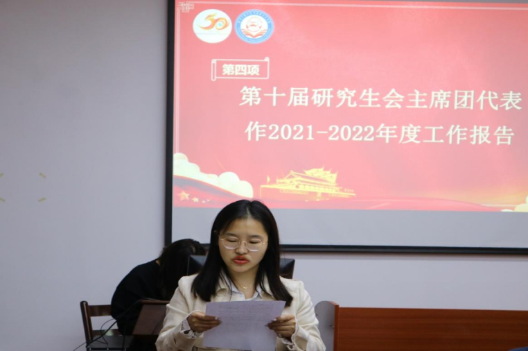 聚会第三项,第十届研究生会主席团代表朱亚美作第十届研究生会事情报告。