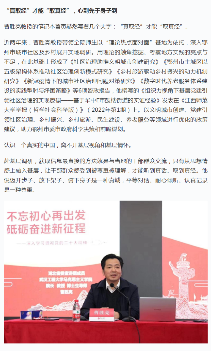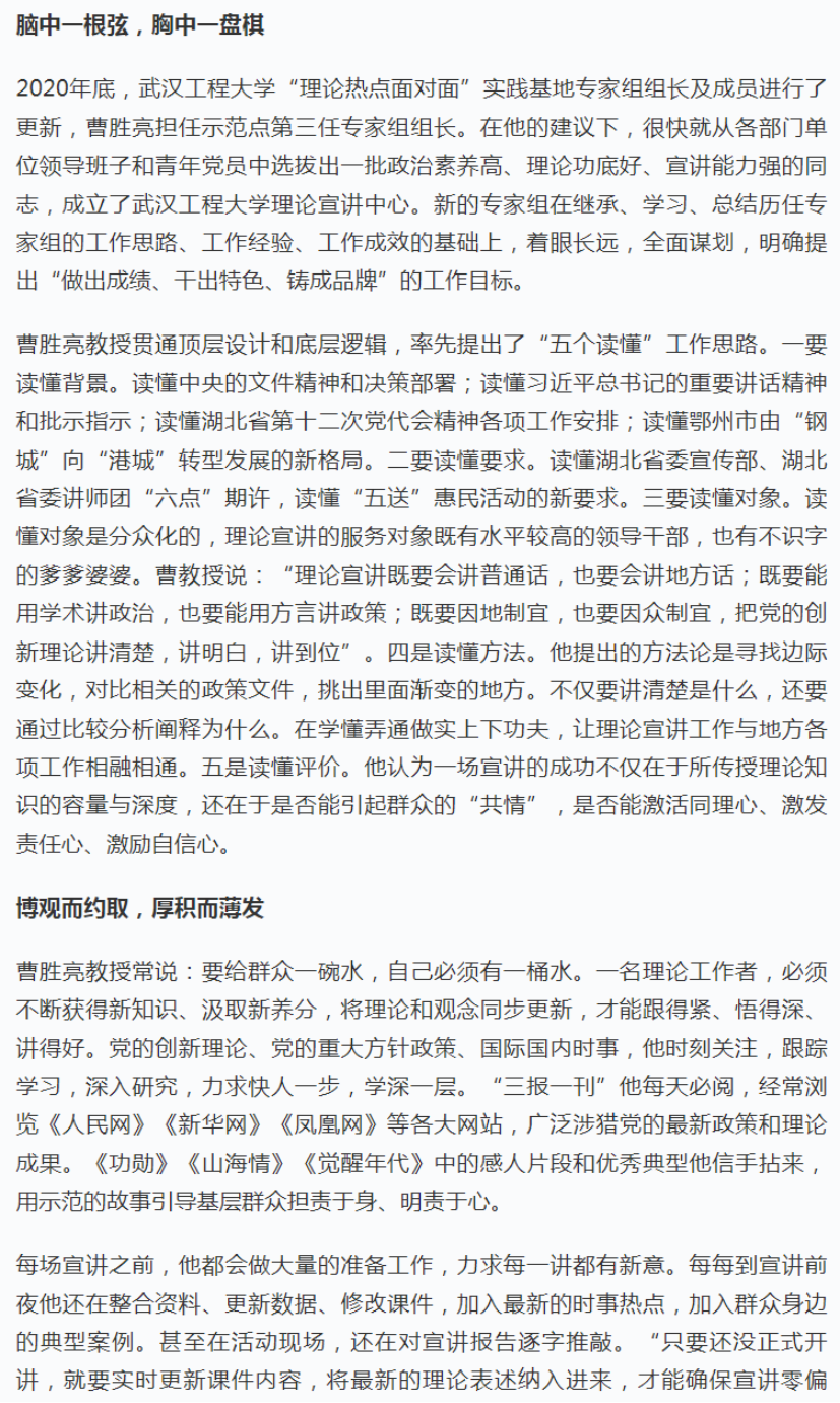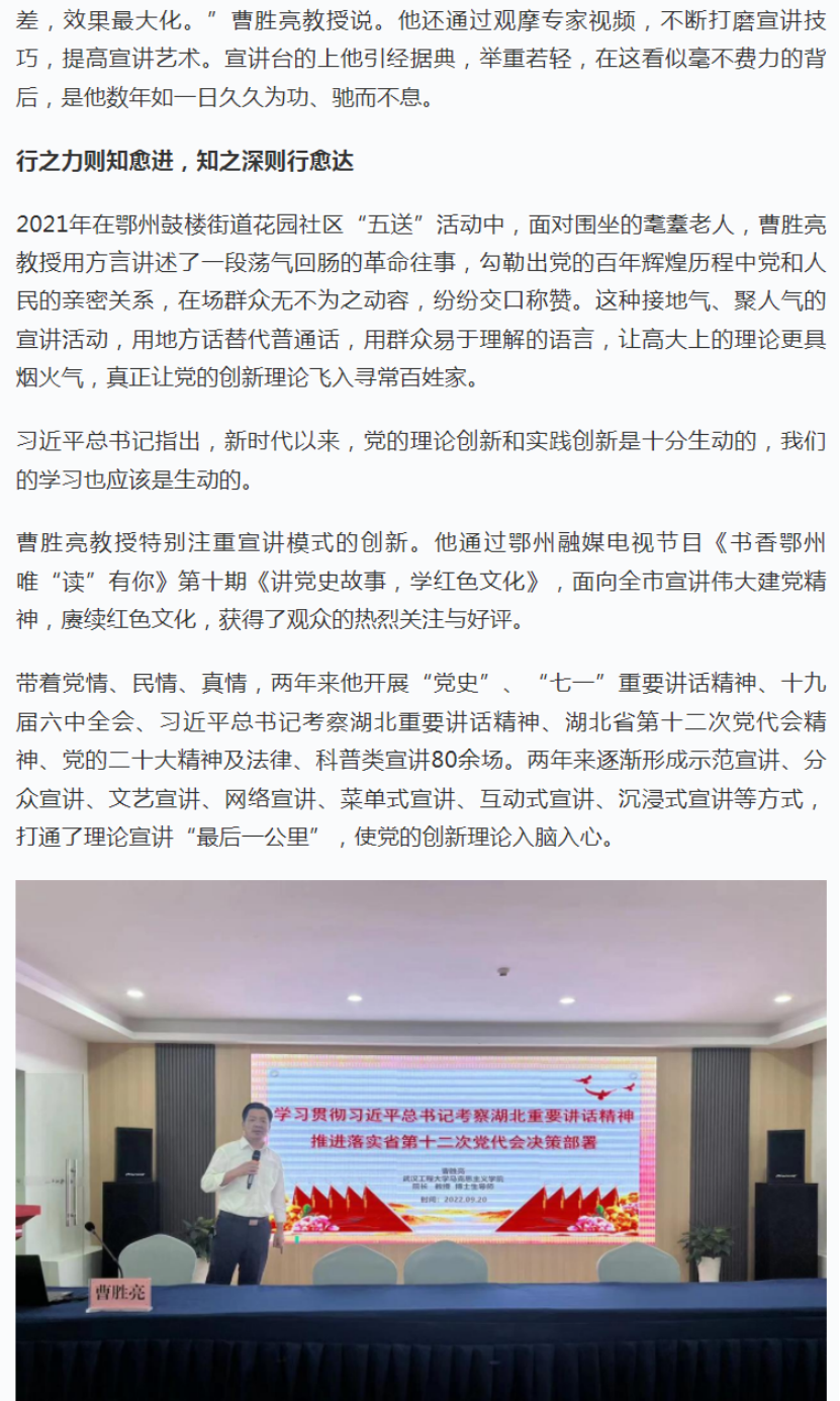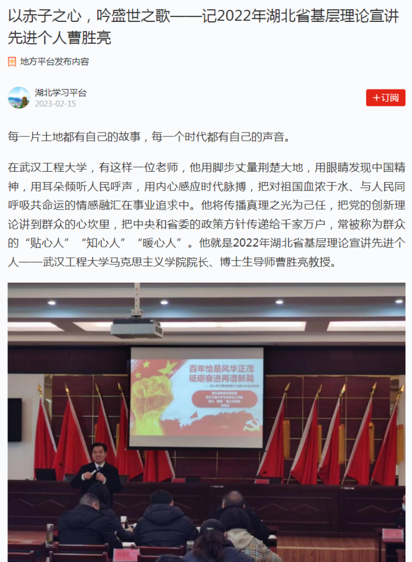 2月15日,我院院长曹胜亮教授登上“学习强国”平台《宣讲风范》栏目,施展了先进典范的树模引领和正向激励作用,引起了公共和媒体的普遍关注。