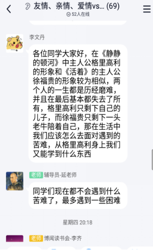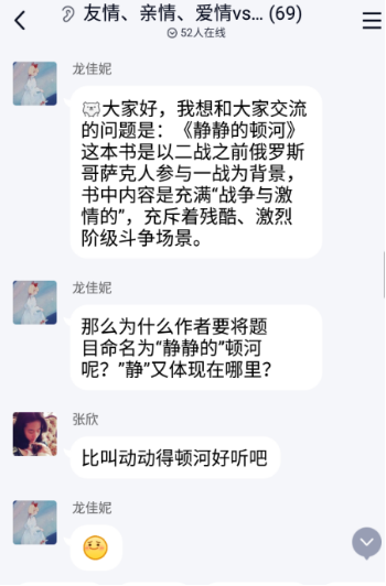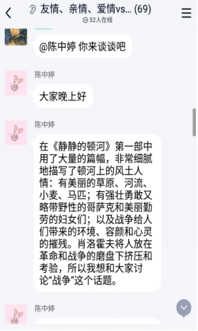首先,刘影同砚从“对社会动荡的反思”、“良心的准则”、“葛利高里和阿克西妮亚的恋爱”三个方面谈了《偷偷的顿河》中人性主义精神的体现。龙佳妮同砚从书中男主人公及他的妻子和情人这三个主要人物的下场反思差别情形下人性的演变,她提出人性不是简单的,而是重大的,体现在现实生涯中,从人们对事务的反应上会体现出来。