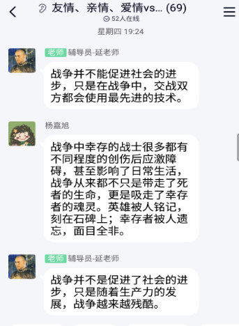 随后,刘娉同砚从宏观上分享了独到看法,她提出作者从悲剧中找寻人物的人格魅力,提醒我们思索问题应该从全方位、多条理去看待问题,突破一直常有的牢靠头脑。李文丹同砚重新的视角,将本书主人公与《在世》主人公比照,她提出对灾祸的生涯要有坚韧的性格,面临无情和残酷的现实,都要顽强的活下去。陈中婷同砚捉住书中时间线索,从景物和人物的细节形貌剖析了战争前后的巨变。
